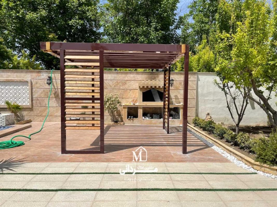 درختچههای تزئینی و گل آرائی به همراه آلاچیق و باربیکیو که محوطهی زیبایی را در باغ ایجاد کرده اند