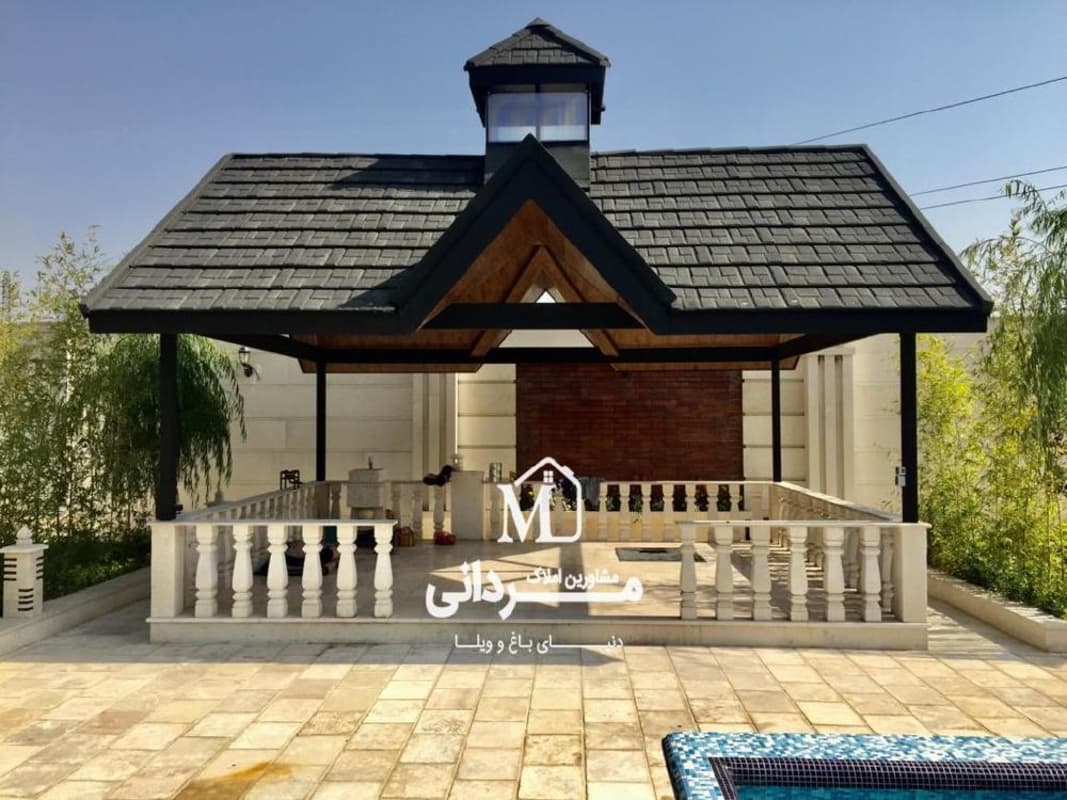دارای نشیمن تابستانی در مجاور استخر بصورت سقف چوبی